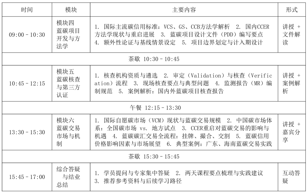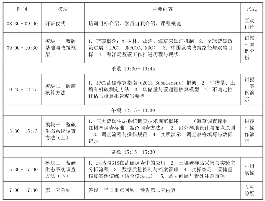 本次培训邀请了国内蓝碳领域的权威专家和一线实践经验丰富的专业人士授课,他们将结合国内外蓝碳产业的最新发展动态和典型案例,深入解读蓝碳调查与核算的技术标准、蓝碳项目开发的流程与方法、蓝碳交易的市场机制与实践操作等内容。培训内容涵盖蓝碳生态系统的基础理论、调查监测技术、碳汇核算方法、项目开发流程、交易规则与风险管理等多个方面,具有很强的针对性和实用性。