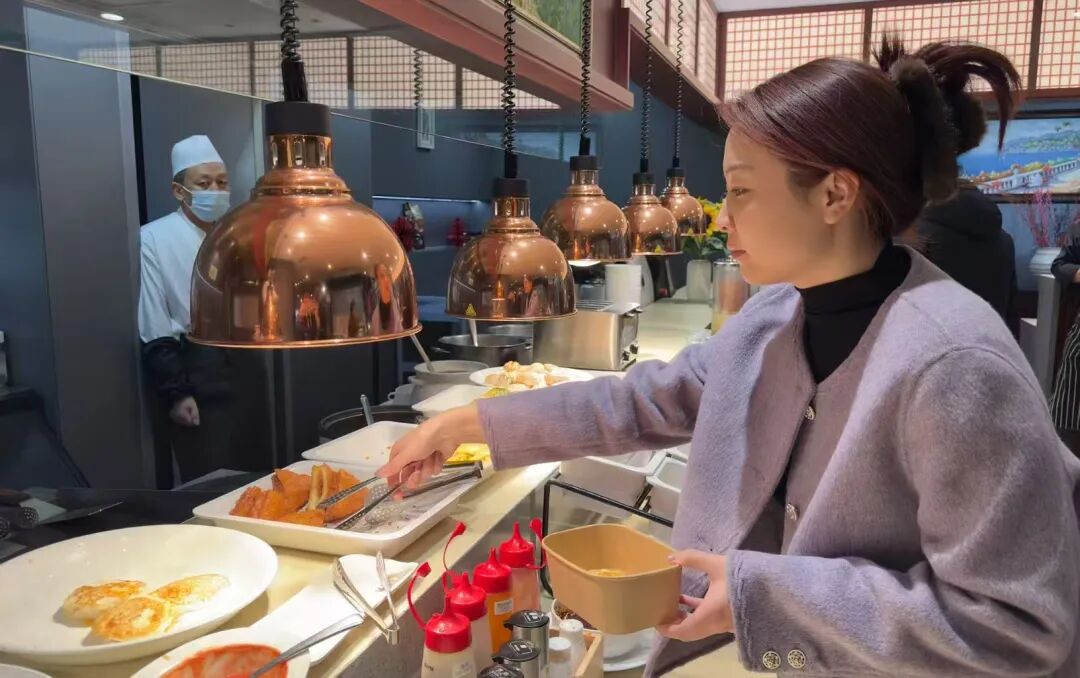 酒店推出便民早餐后,最先成为常客的是周边社区居民。记者看到,有一位六十多岁的阿姨,站在餐台前选了很久。“这么多种类让我选,我反而不知道选什么了。”她笑着对服务人员说,“要不你们帮我配吧。”
