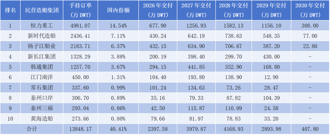 截至2026年3月19日,我国船厂手持订单量达4732艘、34268万载重吨,占全球总量的71.43%,其中,国内民营造船企业贡献了较大份额。从造船集团层面来看,国内排名前十的民营造船集团手持订单量合计达到13848万载重吨,占我国手持订单总量的40.41%,民营力量已成为我国造船业的重要组成部分。从具体排名来看,恒力重工以 4981万载重吨的手持订单量位居国内民企首位,占我国手持订单总量的 14.54%。新时代造船、扬子江船业分别以2436万载重吨、2183万载重吨位列国内第二、三位。前三大势力手持订单量合计达9601万载重吨,国内份额达28.02%。各民营造船集团手持订单将在2026-2030年间完成交付,交付高峰集中在2027-2028年,将分别迎来3980万载重吨、4169万载重吨的新船交付。(撰稿人:杨奕萱)
