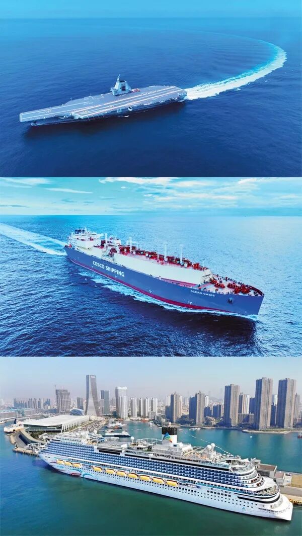 我国已具备建造航空母舰、大型液化天然气运输船、大型邮轮的能力,攻克了造船工业皇冠上的“三大明珠”。上图为2024年5月7日在首航试验中的我国第一艘国产电磁弹射航母福建舰(新华社发 丁子羽/摄)。中图为2025年12月19日在上海交付的中国首艘应用国产殷瓦钢的大型LNG船“远海绿洲”号(中船沪东中华 张良/摄)。下图为2025年4月6日靠泊青岛国际邮轮母港的首艘国产大型邮轮“爱达·魔都号”(新华社记者 李紫恒/摄)。