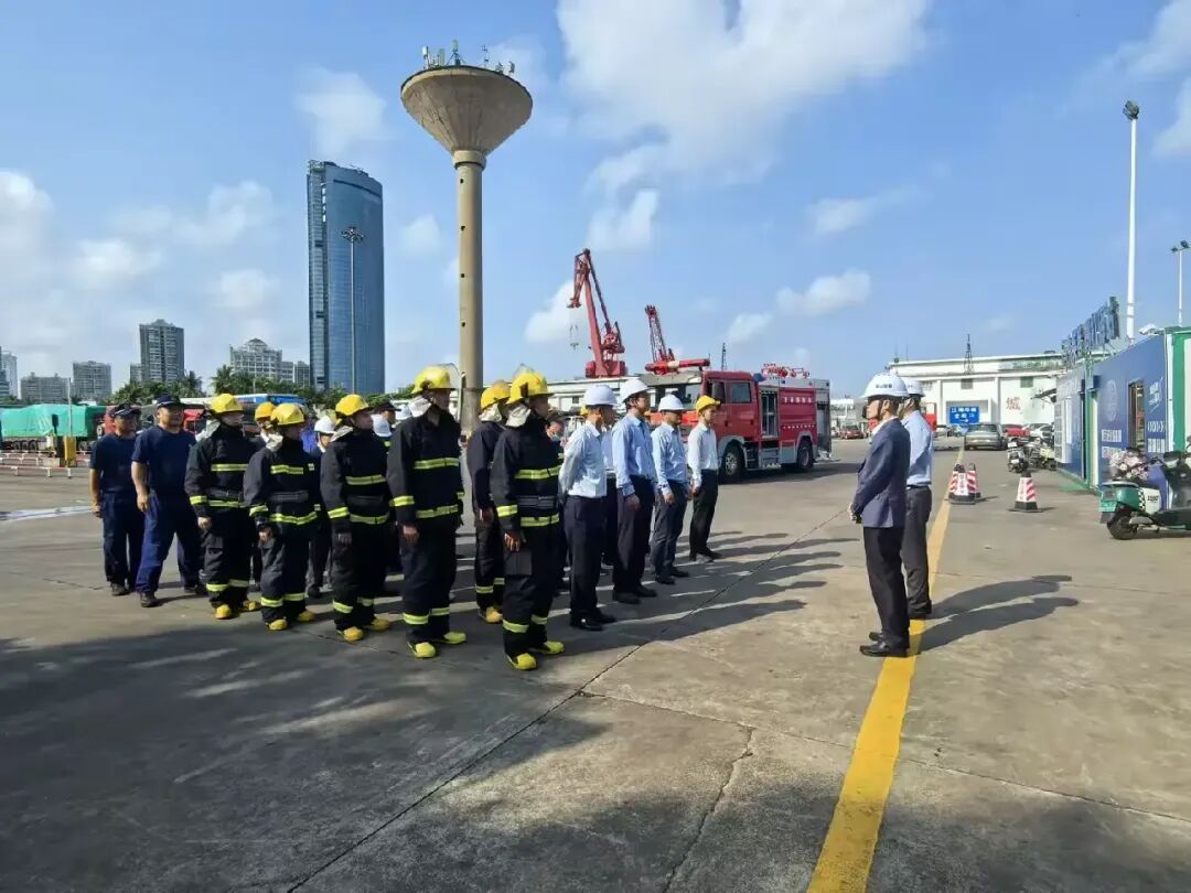 本次演练模拟一辆电动汽车在秀英港4# 待渡车场待渡过程中突发自燃的情景。演练开始后,工作人员发现现场险情,立即组织周边待渡车辆及人员疏散撤离,并逐级上报事故险情。