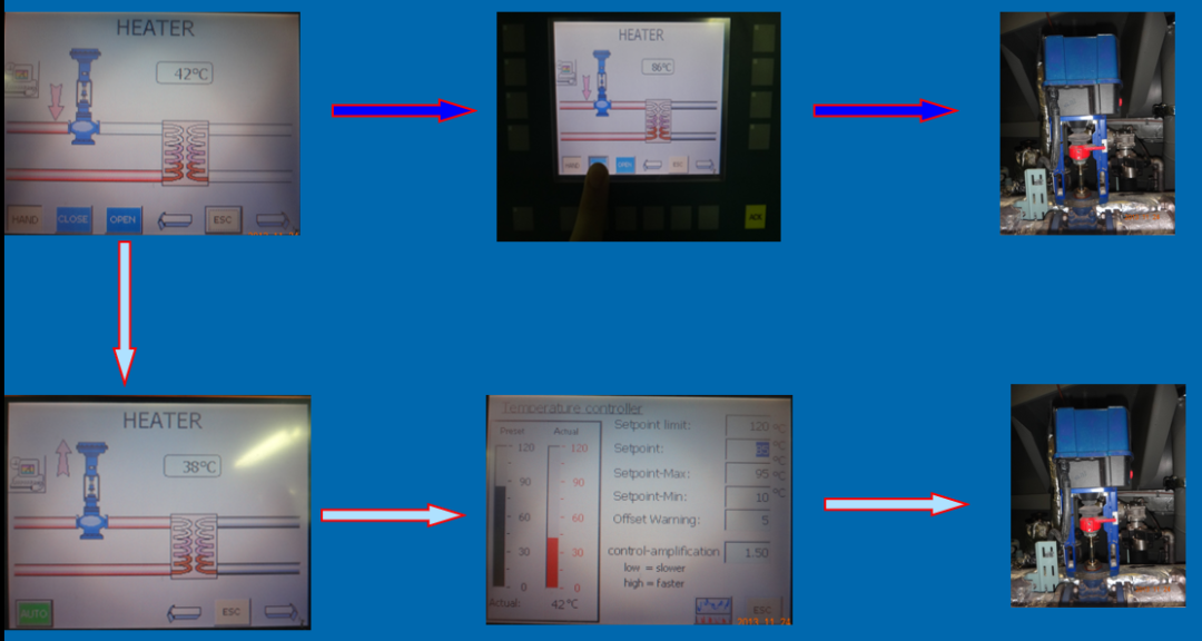 1.手动模式:将模式切换至“HAND”,直接点击“OPEN”/“CLOSE”调节电动阀开度,按需设定污水加热温度;