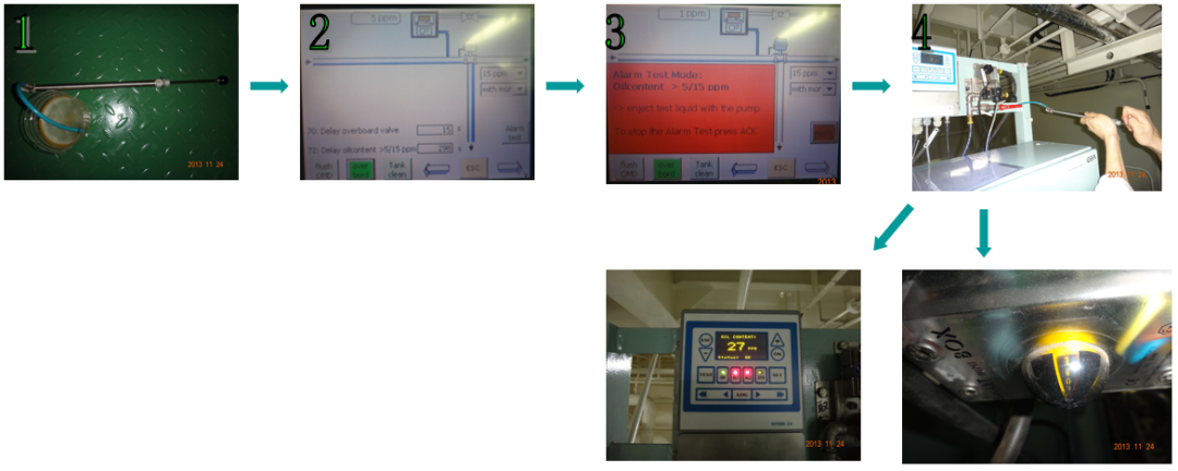 1.将试验枪抽满污水,打开油份监测页面2,在监测值<15ppm时将设备切换为“Over bord”模式,此时界面右下角出现“Alarm test”按钮;
