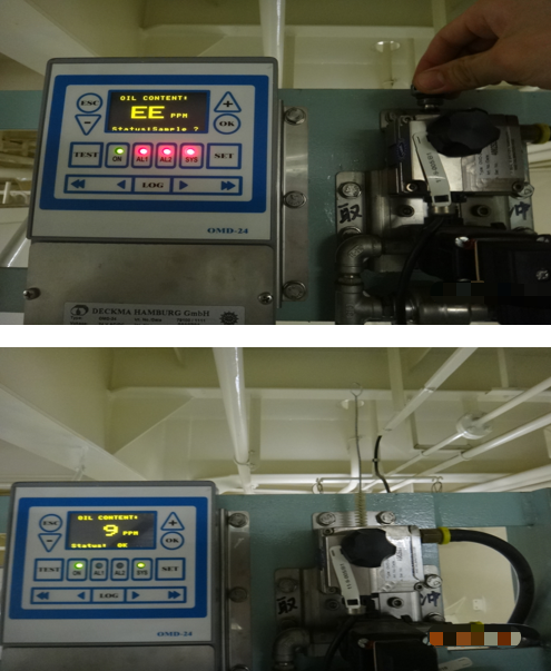 3.将试验枪内污水注入油分检测器,此时油分高警报触发,三通阀自动关闭,油水分离器停止运行(可验证警报与三通阀联动有效性)。