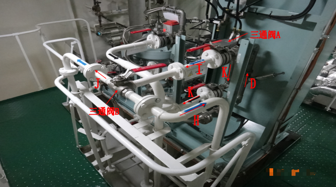 1.检测值<15ppm且设备为排出舷外(Over bord) 模式:三通阀A打开,轻液经I管路,由三通转换阀B选择经J管路排出舷外,或经H管路至漏斗后回流污水柜;