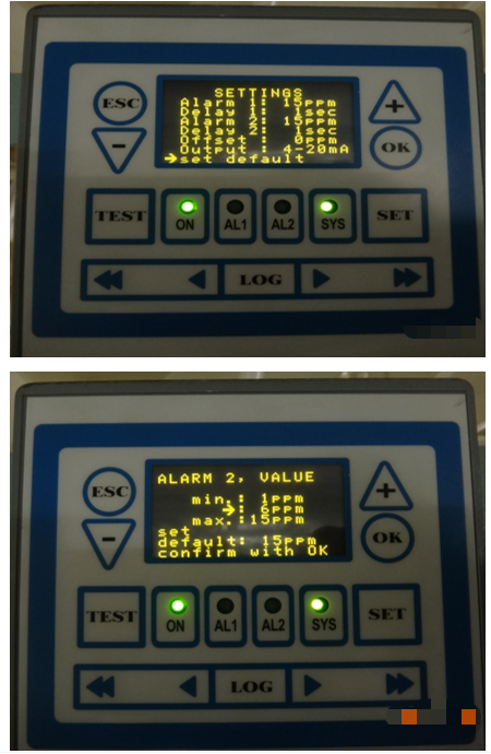 2.按“+”“-”键上下移动光标,选择“ALARM2”选项,再次按“SET”键进入阈值调节;