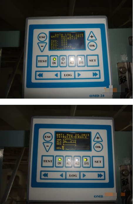 1.在OMD操作面板按“LOG”按钮,首次按下显示文字形式的记录,按左右翻页键可查看历史警报及运行记录;