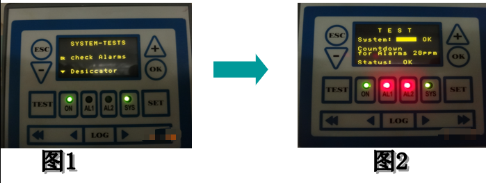 1.在OMD操作面板按“TEST”按钮,屏幕显示“check alarm”;