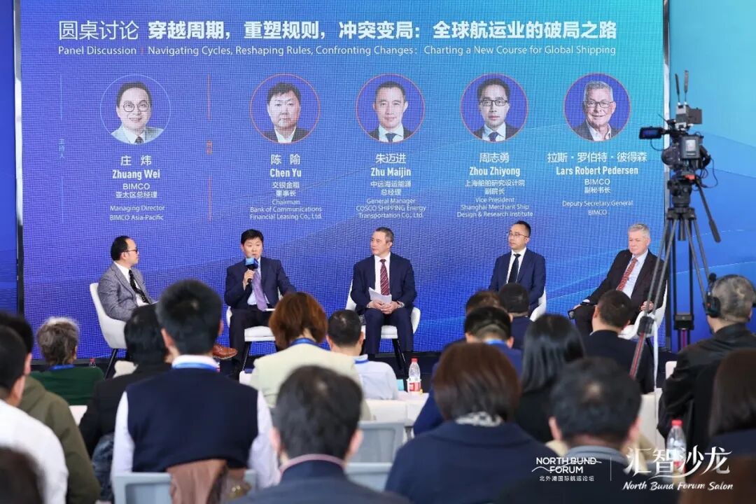 现场的沙龙环节,由BIMCO亚太区总经理庄炜主持,与交银金融租赁有限公司董事长陈隃、中远海运能源运输股份有限公司总经理朱迈进、上海船舶研究设计院副院长周志勇、BIMCO副秘书长拉斯•罗伯特•彼得森(Lars Robert Pedersen)围绕“穿越周期,重塑规则,冲突变局:全球航运业的破局之路”这一话题展开了探讨。