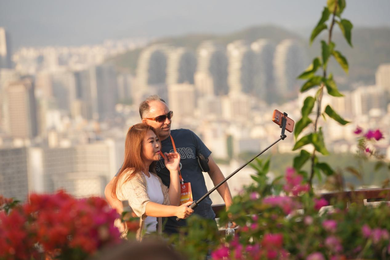 在鹿回头风景区,游客用手机自拍合影。王程龙 摄
