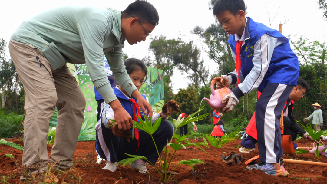 小学生在海南热带野生动植物园参与植树活动。景区供图
