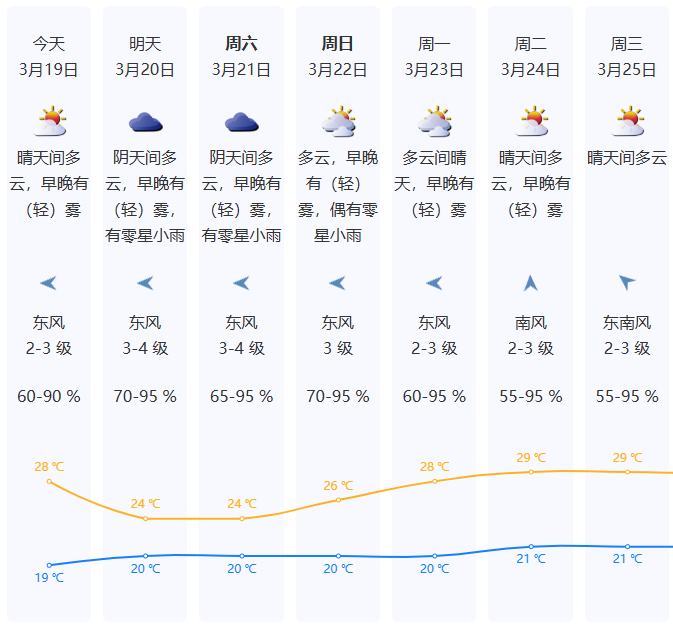 深圳今日晴天间多云,早晚有(轻)雾;气温19-28℃;东风2-3级;相对湿度60%-95%。