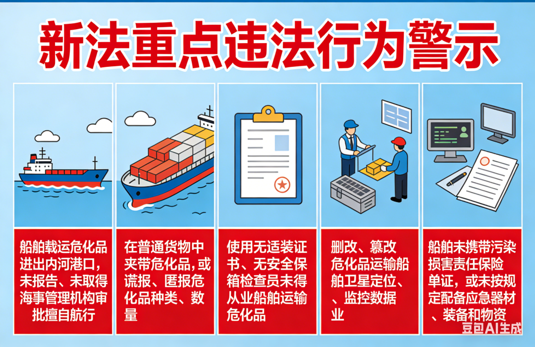 新法明确了水路运输环节危化品安全管控核心要求,重点升级以下5点,危化品航运企业、相关从业者请重点关注: