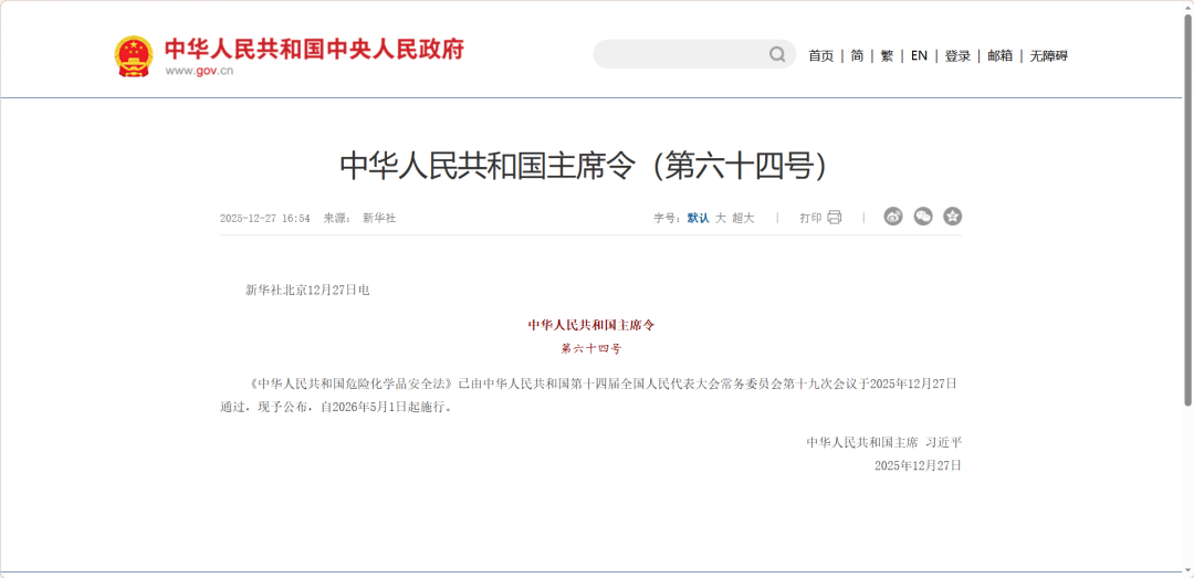 《中华人民共和国危险化学品安全法》,将于2026年5月1日正式施行。该法经第十四届全国人民代表大会常务委员会第十九次会议于2025年12月27日通过,共10章127条,覆盖生产、储存、使用、经营、运输全链条,以“人民至上、生命至上”为核心,构建了全生命周期安全监管体系。核心变化用4个关键词就能理清: