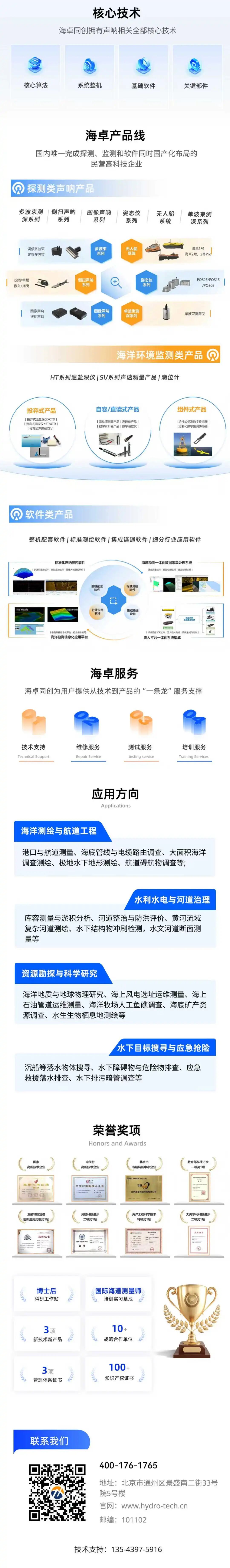 北京海卓同创科技有限公司是一家聚焦在水下勘探领域,致力于掌握核心技术和自主知识产权,研发、生产、销售声呐及相关产品的国家级高新技术企业和北京市专精特新企业。公司员工总数150人左右,产研及技术团队90人左右,博硕学历员工30人。目前公司总部和探测类声呐产品研发公司设立在北京、软件产品研发公司设立在青岛,监测类声呐产品研发、规模生产基地和测试基地设立在天津,形成了完整的产业链。公司成立于2016年,经过10年的发展,已成功布局探测、监测、观测三大应用领域,实现了对进口产品的国产化替代,成为声呐行业的领军企业。