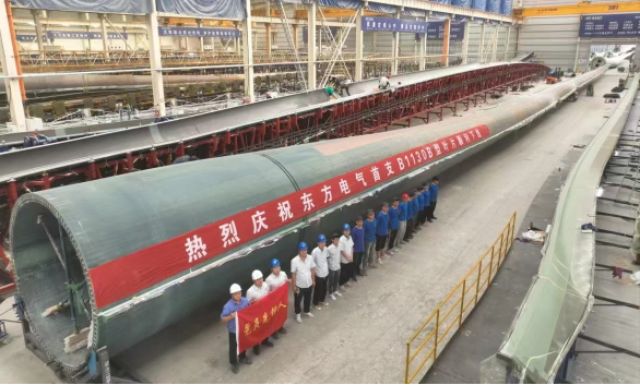 该款叶片为国内首支完成研发制造的150米级超大型海上风电叶片,叶片设计使用了超高性能碳纤维拉挤板,首次开展超宽超厚的碳纤维拉挤板主梁帽制造,突破了超宽超厚的主梁灌注工艺瓶颈,采用超长柔性叶片的模块化一体成型关键制造工艺技术,突破了超大尺寸叶片生产制造难题。该叶片具有气动性能好、结构可靠的特点,有力支撑海上大功率机组发展。