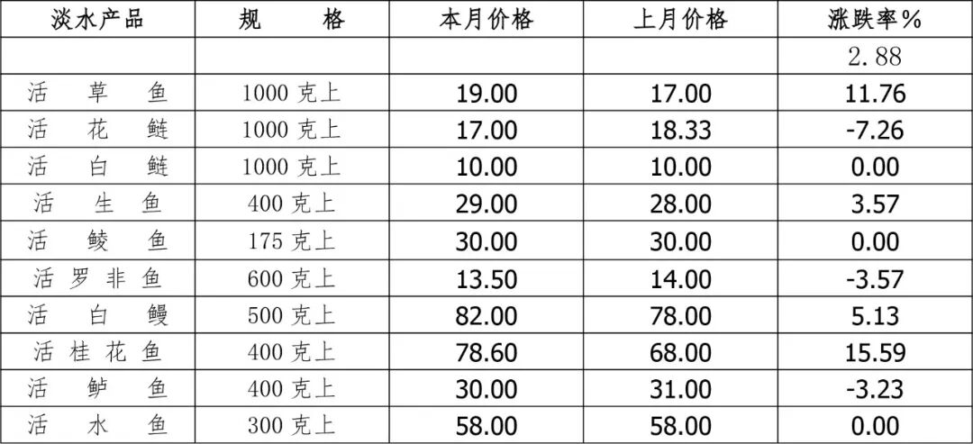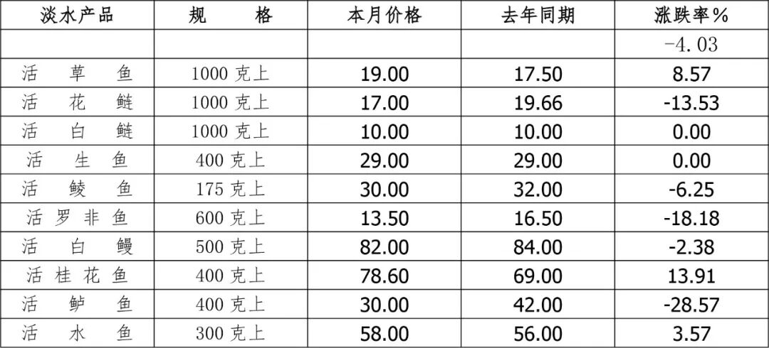 品种方面,草鱼(1000克以上)为19.00元/千克,环比升11.76%、同比升8.57%;生鱼(400克以上)为29.00元/千克,环比升3.57%、同比持平;桂花鱼(400克以上)为78.60元/千克,环比升15.59%、同比升13.91%;罗非鱼(600克以上)为13.50元/千克,环比降3.57%、同比降18.18%。(表5、6)