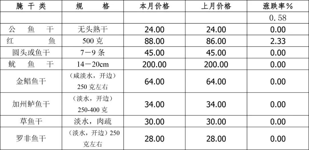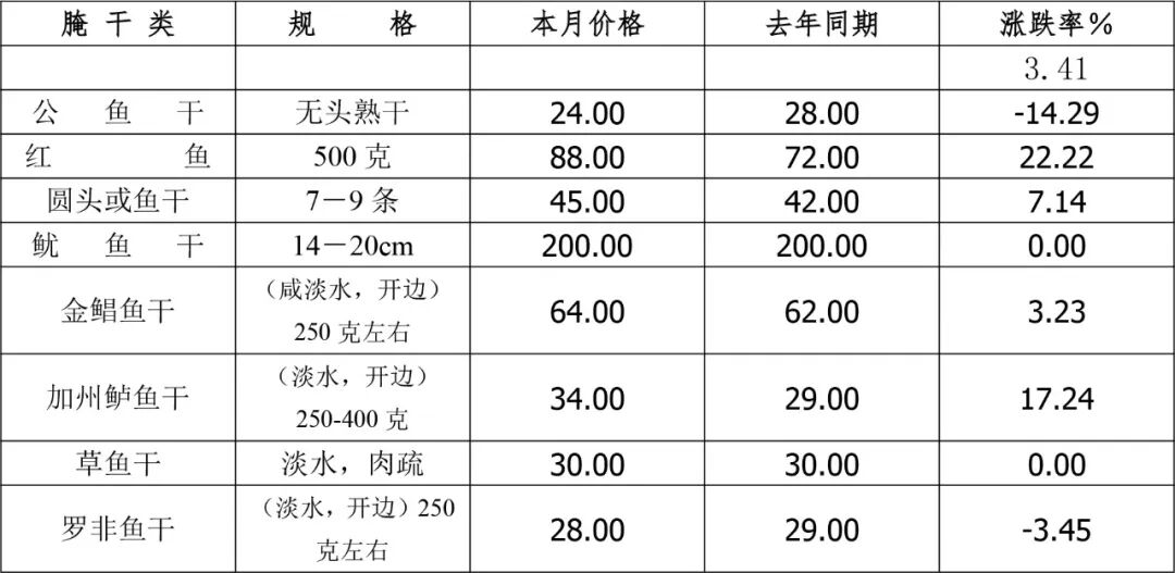 品种方面,公鱼干(无头熟干)为24.00元/千克,环比持平,同比降14.29%;红鱼(500克)为88.00元/千克,环比升2.33%、同比升22.22%;金鲳鱼干(咸淡水,开边,250克左右)为64.00元/千克,环比持平、同比升3.23%;加州鲈鱼干(淡水、开边,250-400克)为34.00元/千克,环比持平、同比升17.24%。(表11、12)