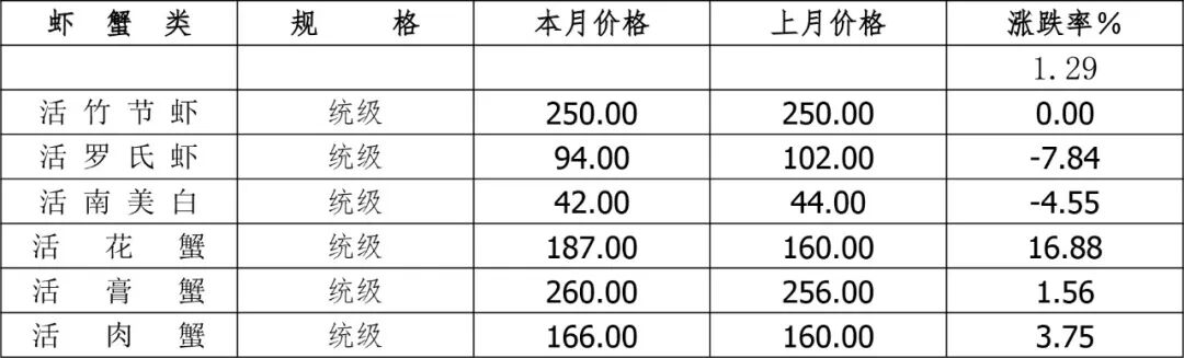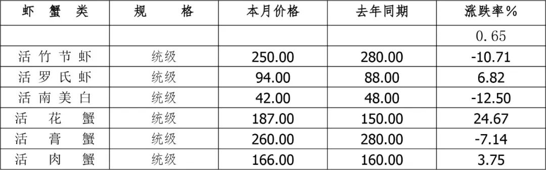 品种方面,罗氏沼虾(统货)为94.00元/千克,环比降7.84%、同比升6.82%;南美白对虾(统货)42.00元/千克,环比4.55%、同比降12.50%;花蟹(统货)为187.00元/千克,环比升16.88%、同比升24.67,肉蟹(统货)为166.00元/千克,环比、同比升3.75%(表7、8)。