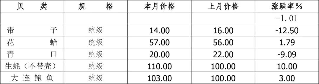 品种方面,带子(统货)为14.00元/千克,环比降12.50%、同比降6.67%;青口(统货)为20.00元/千克,环比降9.90%、同比降41.18%;生蚝(不带壳)为110.00元/千克,环比升10.0%、同比降8.33%。(表9、10)
