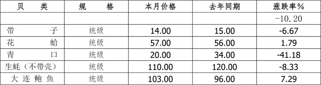 贝类市场整体受消费需求疲软、价格表现偏弱。青口价格同比回落,成为主要拖累同比下滑10.20%的原因。