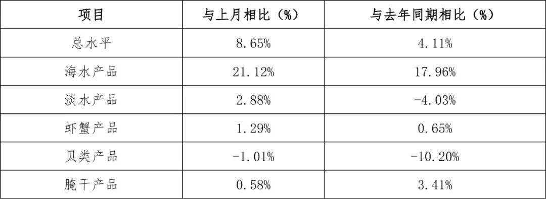 全省水产品价格总水平环比升8.65%,同比上涨4.11%。其中海水产品价格环比升21.12%,同比上涨17.96%。淡水产品价格环比升2.88%,同比下降4.03%。虾蟹类价格环比升1.29%,同比微涨0.65%。贝类价格环比降1.01%,同比下滑10.20%。腌干类价格环比升0.58%,同比上涨3.41%。(表2)