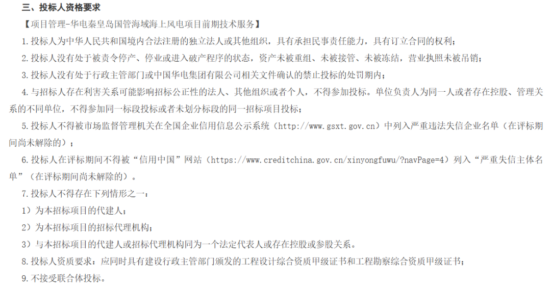 招标范围:招标项目划分为1个标段,具体为:项目管理-华电秦皇岛国管海域海上风电项目前期技术服务(CHDTD204616-QT-89901):华电秦皇岛国管海域海上风电项目前期技术服务,包括但不限于海上风电预选址研究专题、预可行性研究报告(含竞争性配置投标文件)、可行性研究报告及技术专题、风能资源专题、水文观测及分析、地质初勘及地形图测绘工作、用地、用海预审专题、海洋环境影响专题、陆域设施环评影响专题、通航安全影响论证专题、海缆路由等工作。特别声明:本平台转载其他网站内容,出于传递更多信息而非盈利之目的,同时并不代表赞成其观点或证实其描述,内容仅供参考。版权归原作者所有,若有侵权,请联系我们删除。
