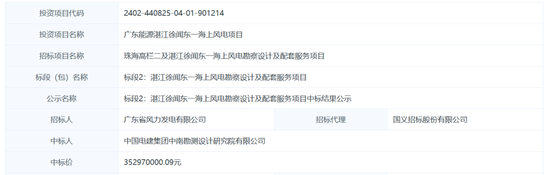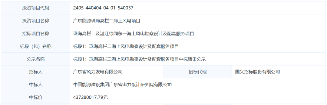 近日,广东省公共资源交易中心发布珠海高栏二及湛江徐闻东一海上风电勘察设计及配套服务项目中标结果公示的公告。