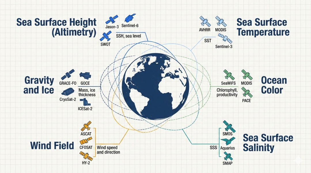 卫星是实现全球覆盖的唯一手段,提供多种海洋基本变量的连续监测。