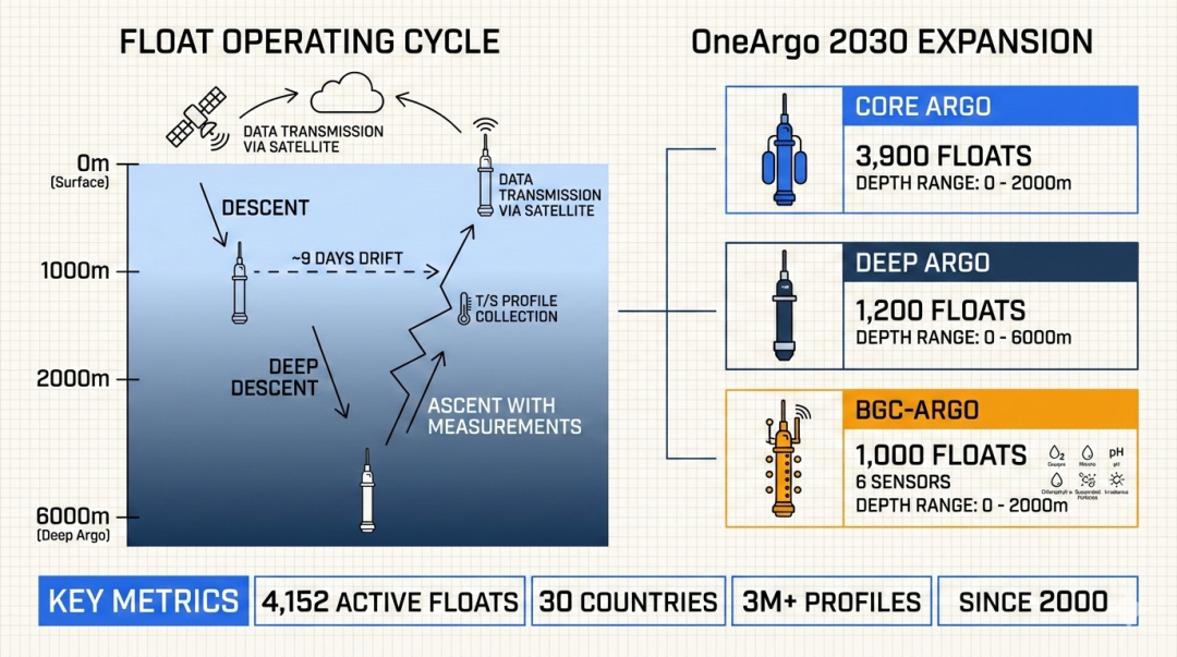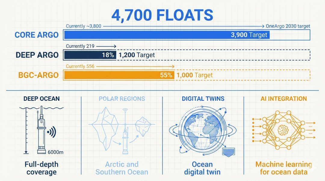 到 2030 年,部署 4,700 个浮标的 OneArgo 阵列(含 Core + Deep + BGC),实现从海面到海底、从物理到生物地球化学的全方位全球海洋观测。