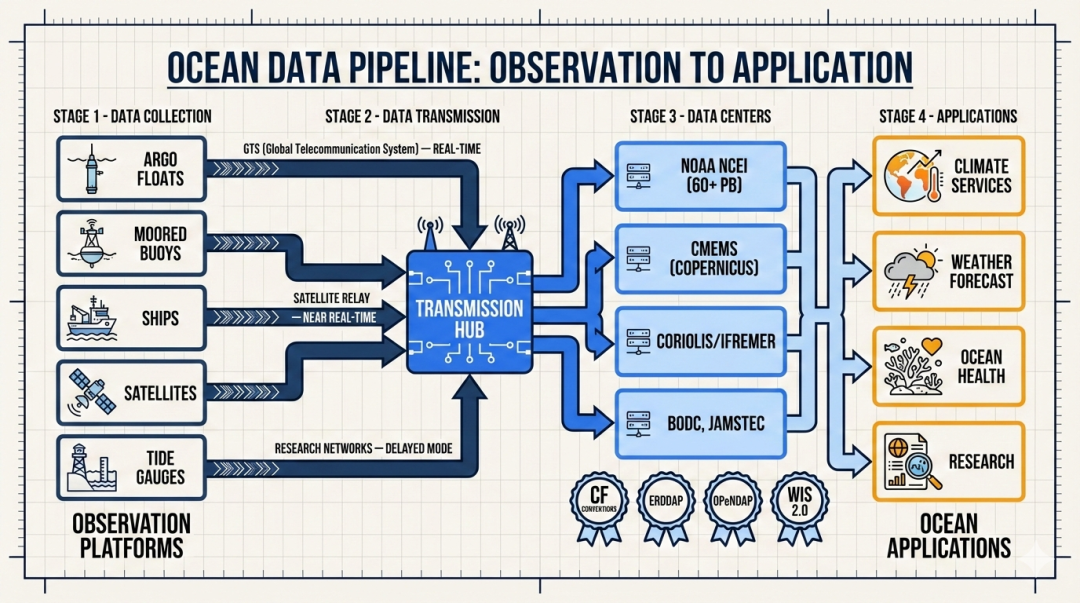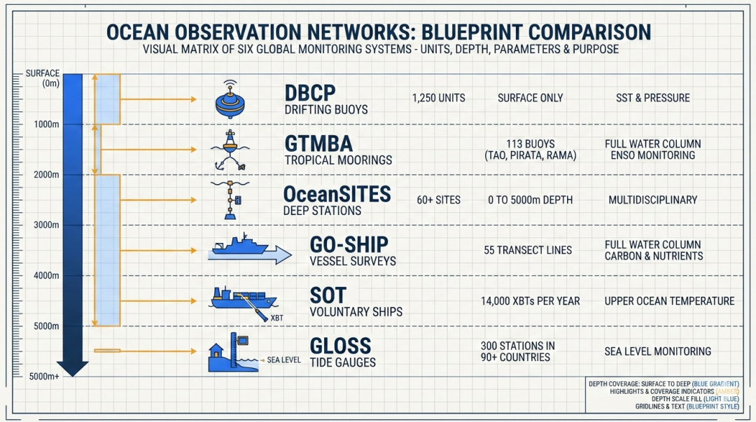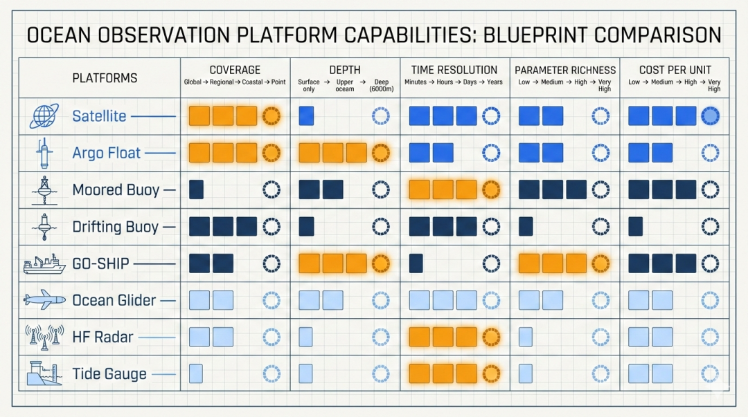 全球海洋观测体系就像一张多层的"感知网络",卫星看全貌、浮标测剖面、船舶做精测、验潮站守海岸,每一个组件都不可替代。理解这张网络,就是理解人类认知海洋的方式。