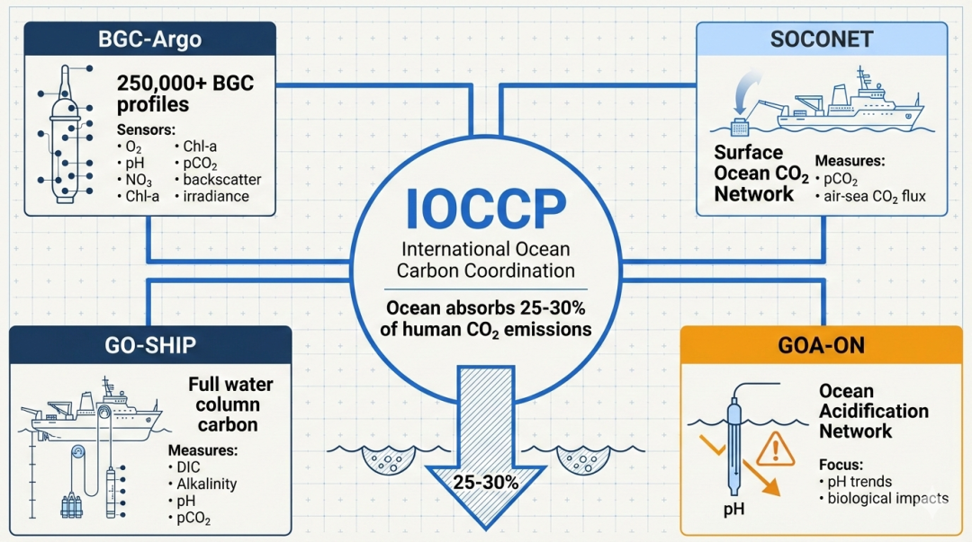 海洋吸收了约 25-30% 的人类排放 CO₂,碳观测是海洋观测的核心维度: