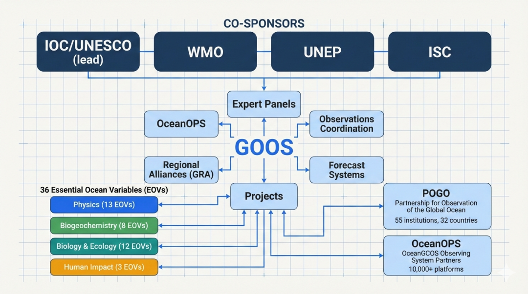 GOOS(Global Ocean Observing System,全球海洋观测系统)是全球海洋观测的顶层协调框架,由四个国际组织共同主办: