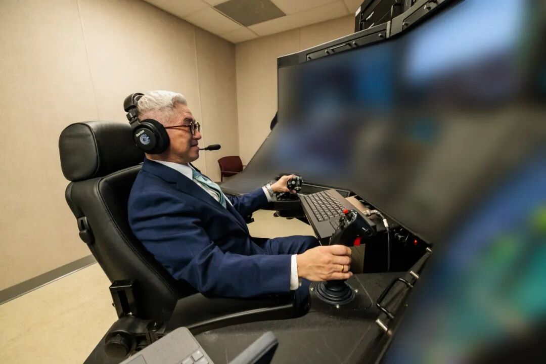 ▲3月17日,中国台湾省伪防务副负责人体验MQ-9B型机飞控系统.