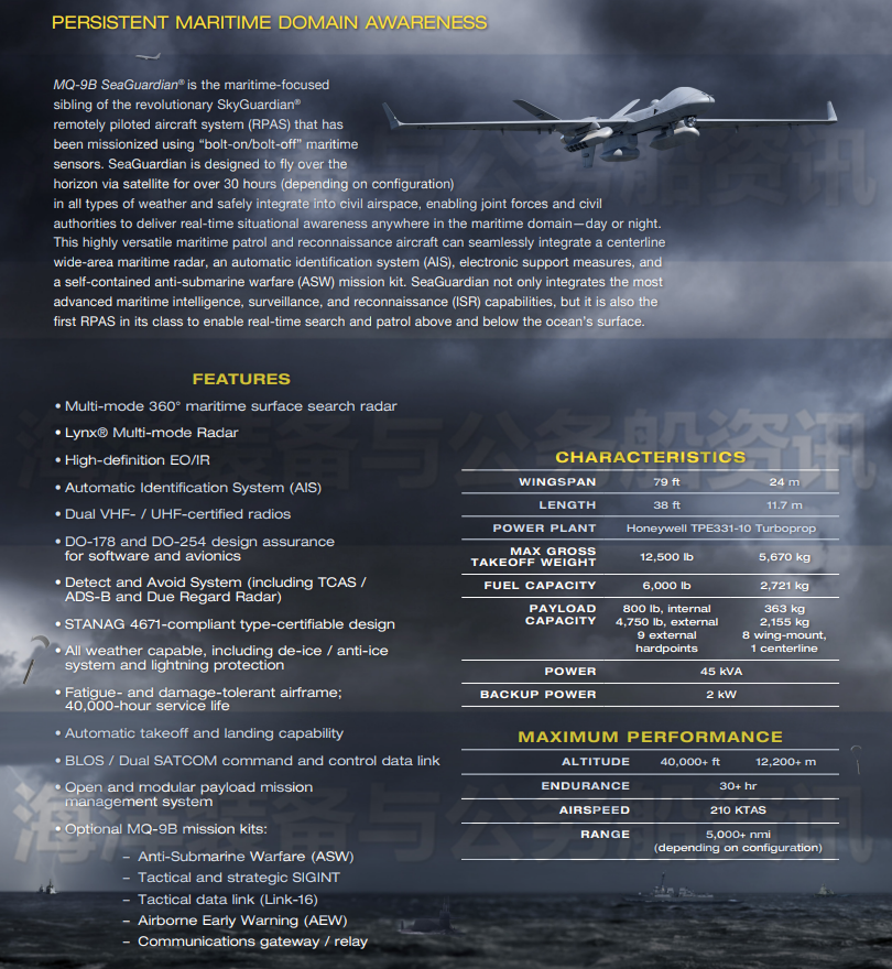 MQ-9B型无人侦察机翼展24米、机体长度11.7米,动力系统配备霍尼韦尔公司的TPE331-10型涡桨螺旋桨发动机,使用升限达到12200米,航程不小于9260公里(依据挂载任务性质而定),滞空时间大于30小时,最大起飞重量5.6吨,燃油携带量为2,7吨。其任务载荷配置中的一个关键部分是莱昂纳多的Seaspray-7500E V2型 AESA雷达(有源相控阵雷达),该雷达被安装在机体中心线吊舱内,具备反向合成孔径雷达功能,能够在海上搜索和救援行动中探测水面目标,包括船只、潜艇潜望镜和人员。其还可配备多模式360海面搜索雷达及自动识别系统(AIS),完成长时间追踪海上与地面目标的任务。另外,该机经升级后,可以挂载反潜声呐浮标吊舱及反潜武器执行海上反潜任务。