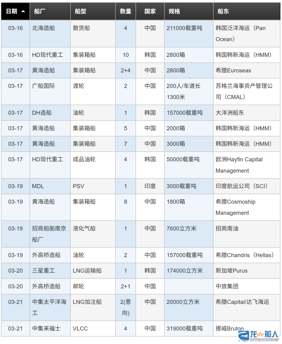 船厂订单汇总(3.16-3.22):上周56+5艘