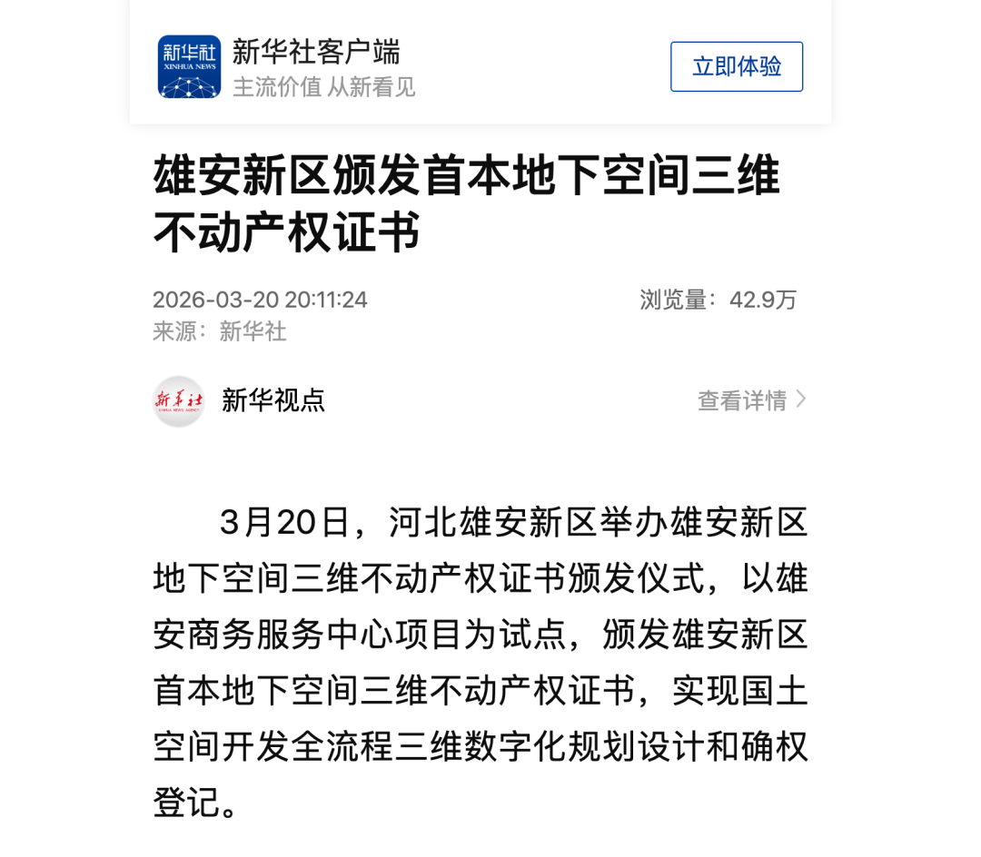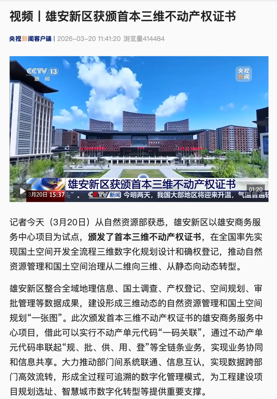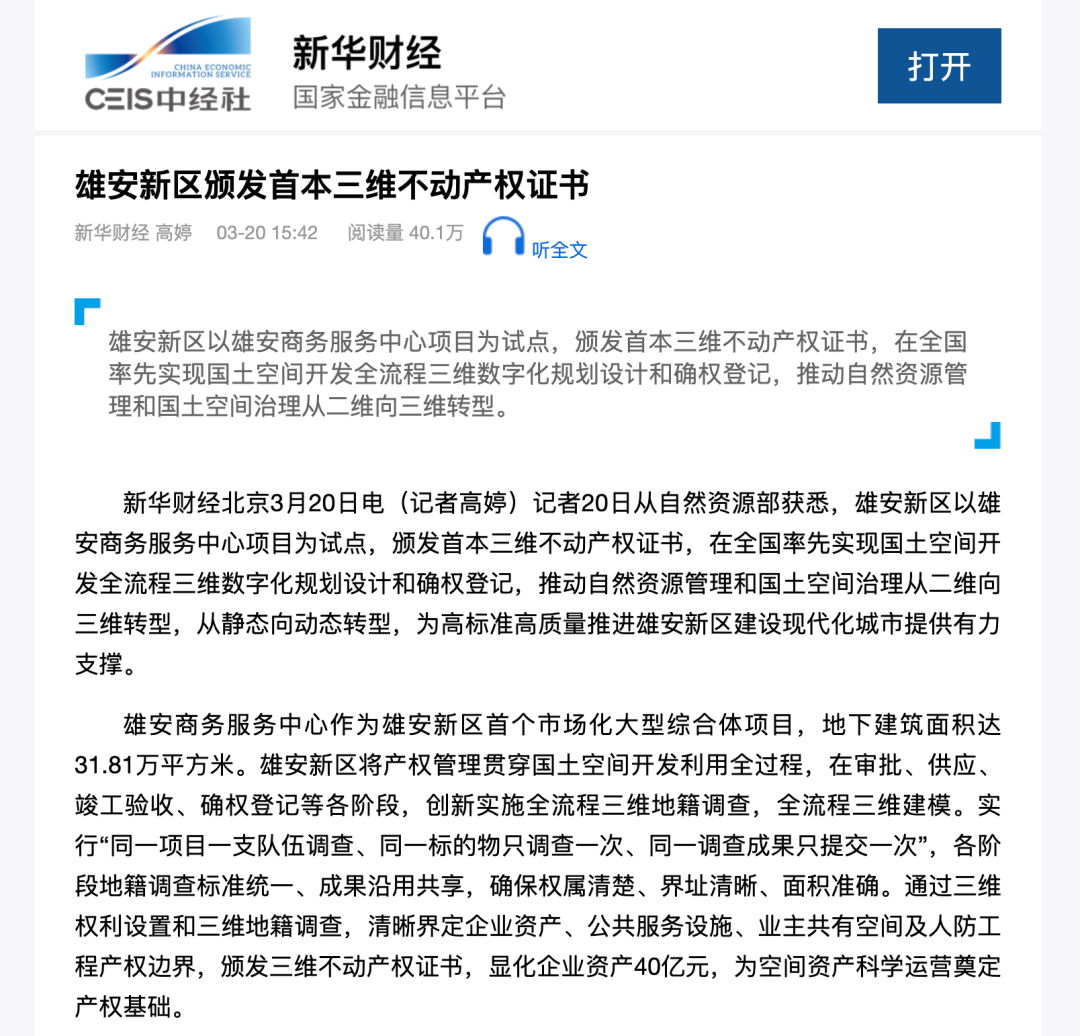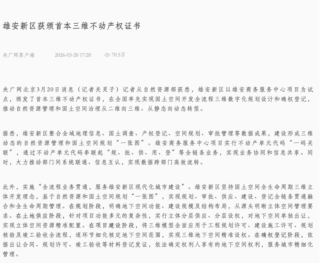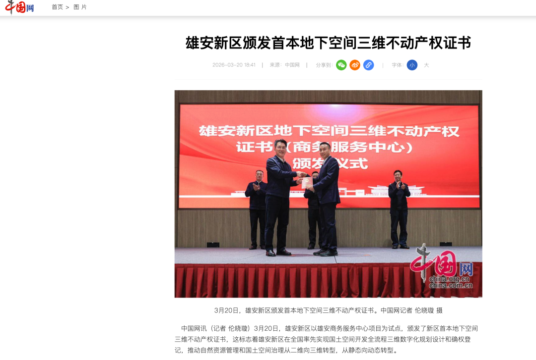 3月20日,河北雄安新区举办雄安新区地下空间三维不动产权证书颁发仪式,以雄安商务服务中心项目为试点,颁发了首本三维不动产权证书。新华社、央视新闻、人民网、《光明日报》、新华财经、央广网、中国网、中国新闻网、澎湃新闻、香港文汇报、新黄河客户端等媒体进行了报道。