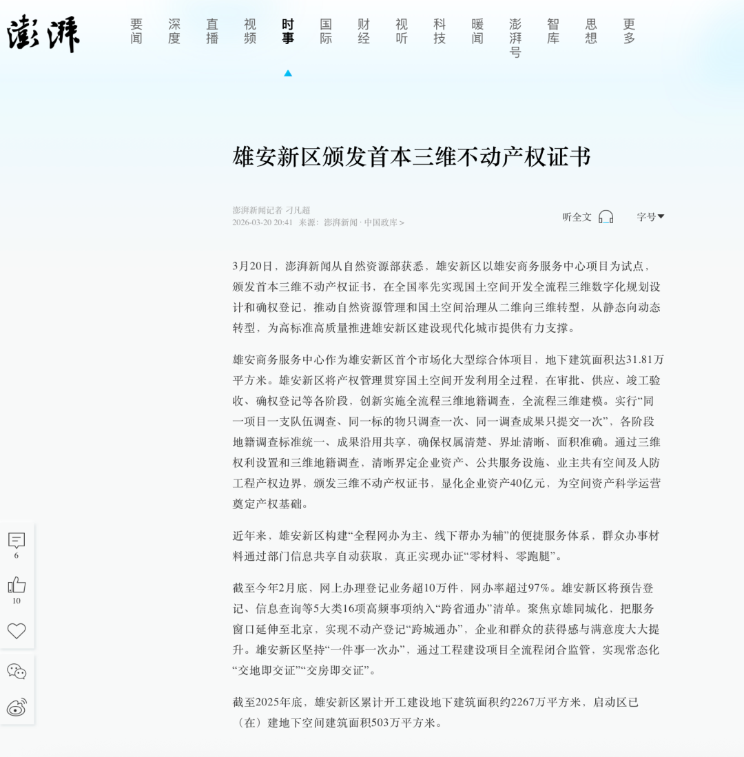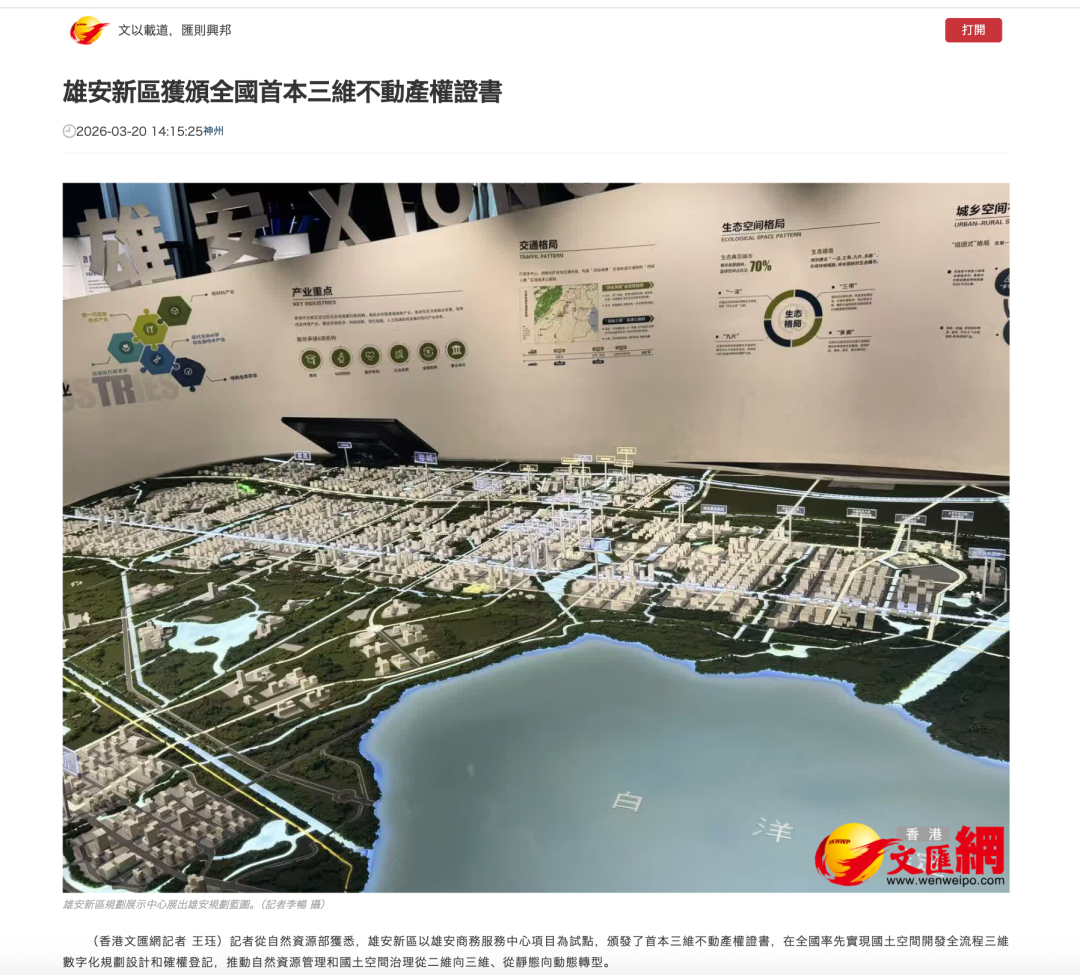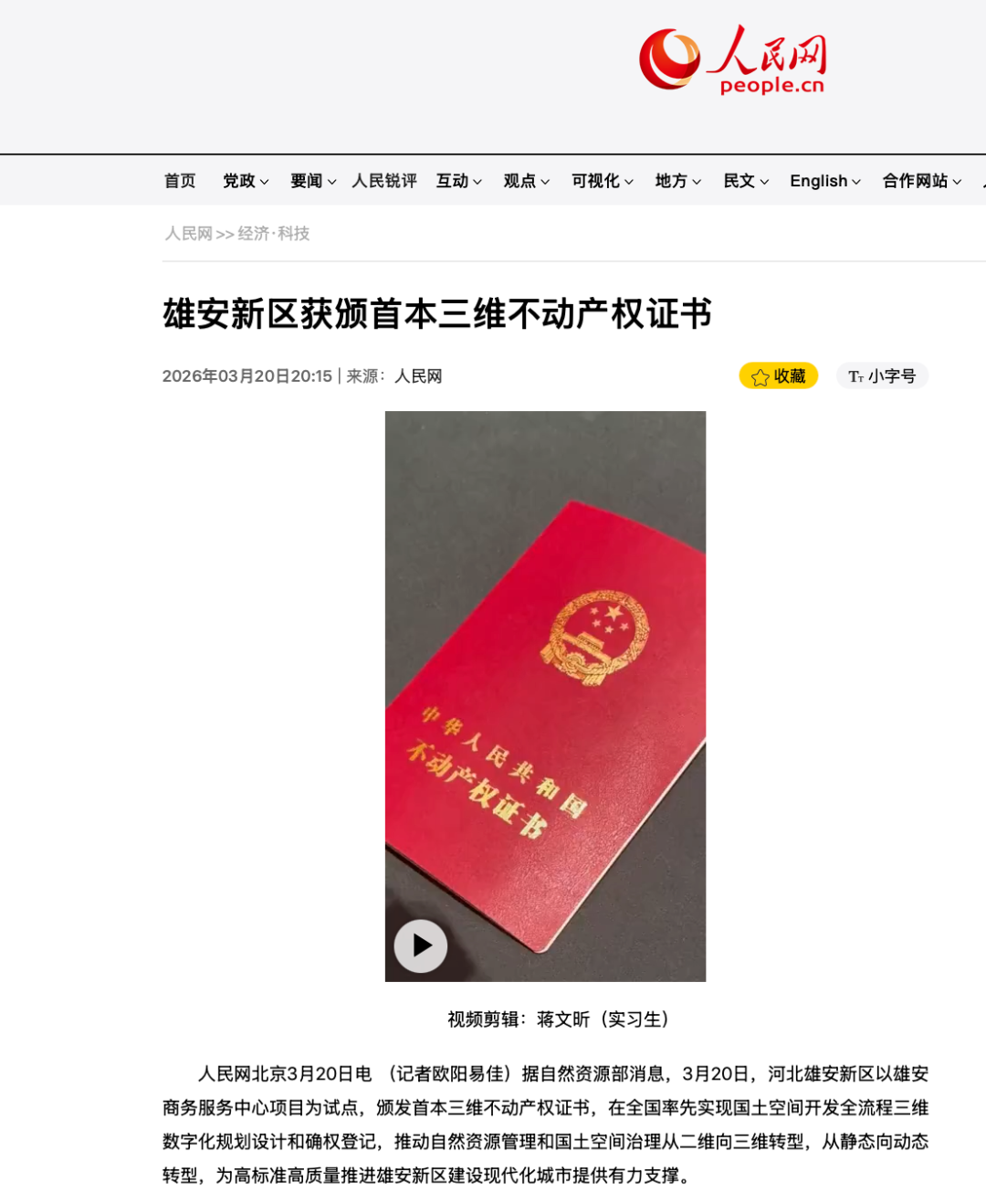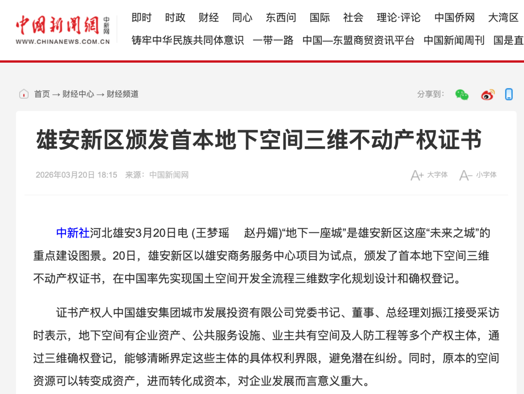 3月20日,河北雄安新区举办雄安新区地下空间三维不动产权证书颁发仪式,以雄安商务服务中心项目为试点,颁发了首本三维不动产权证书。新华社、央视新闻、人民网、《光明日报》、新华财经、央广网、中国网、中国新闻网、澎湃新闻、香港文汇报、新黄河客户端等媒体进行了报道。