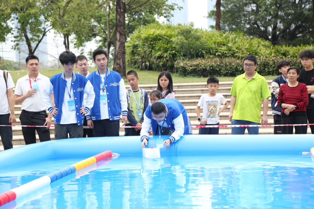 “蓝鲸队,11秒57!”室外竞速环节,成为整场赛事的高光时刻,马达的嗡鸣、飞溅的水花与现场观众的欢呼呐喊交织在一起。10米长的水池化作选手们的逐浪赛道,各支队伍按抽签顺序依次登场,随着发令信号响起,一艘艘凝聚着团队心血的自制船模破水而出,在水面上平稳疾驰、奋勇争先,有的船模一骑绝尘,以极快的速度平稳冲过终点线,引来全场喝彩;有的船模首次航行出现小插曲,选手们迅速复盘调整,在第二次航行中逆风翻盘,上演精彩逆袭。水面上每一次平稳的起航、每一次全力的冲刺,都是湾区青年科创智慧的集中呈现,更是他们向海而行、逐梦深蓝的生动缩影。