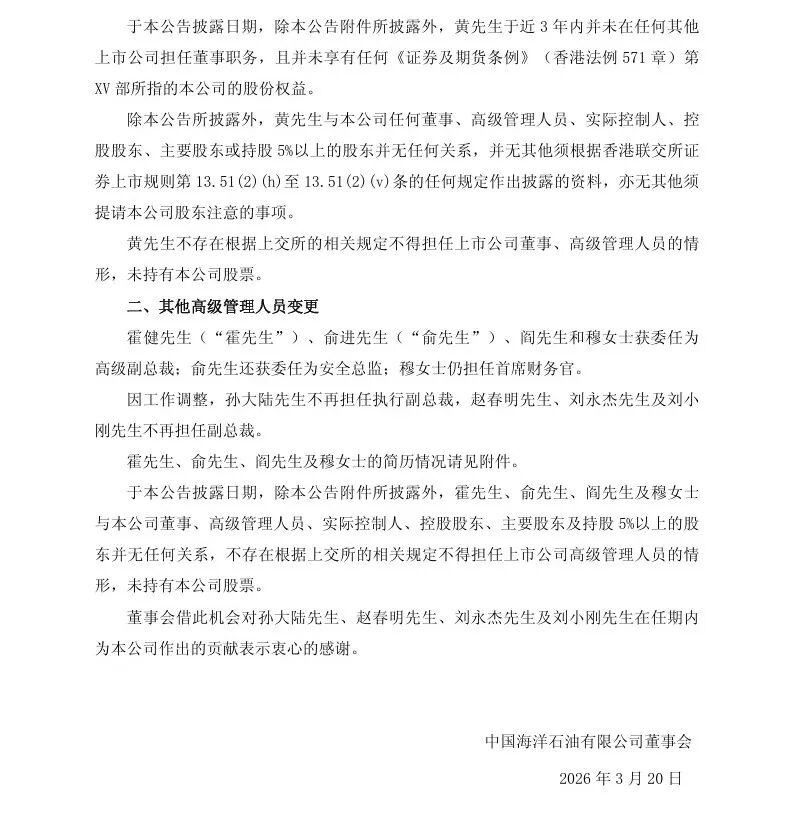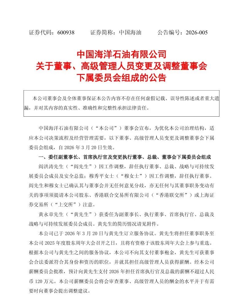 3月20日,中国海油对外宣布多项管理层人事调整公告: