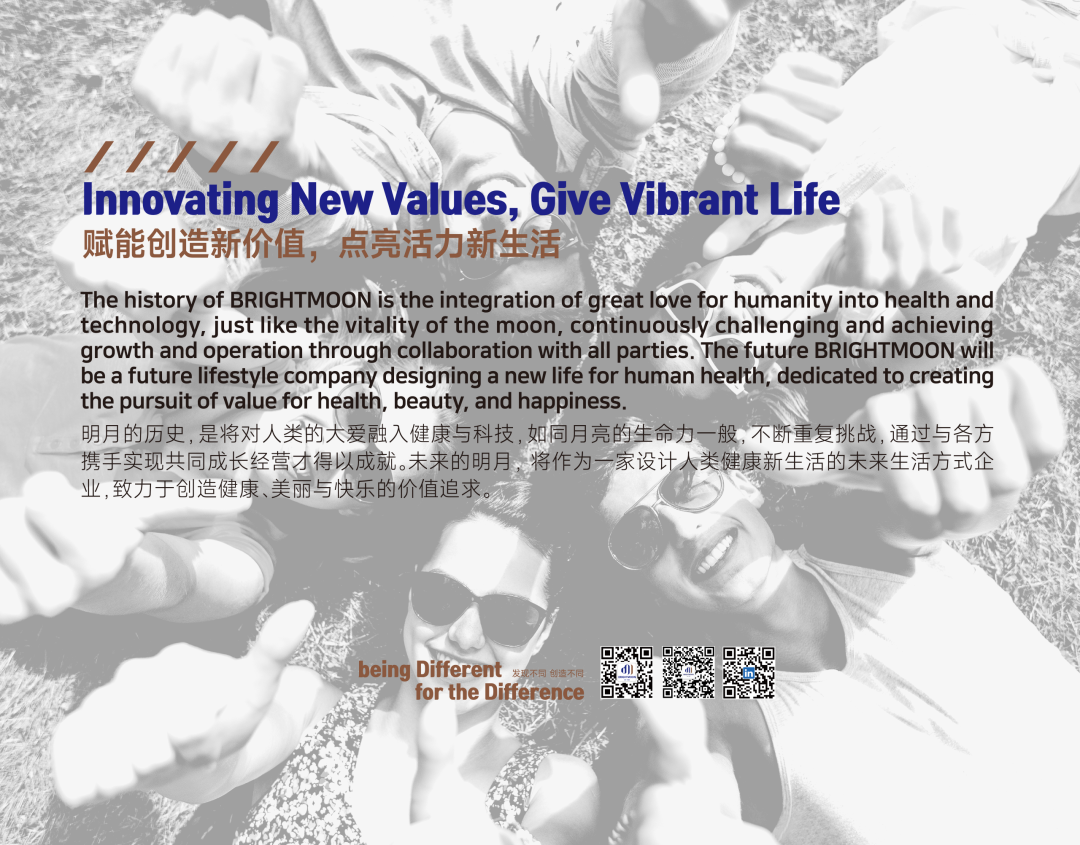 明月始终坚信,企业的成长不仅源于技术与产品,更源于文化的力量。58年的发展历程中,我们不断传承与创新,凝聚出独特的明月精神——以利他与信赖为基础,以创新与融合为驱动,将对人类健康的关注融入每一次技术突破与产品表达之中。“赋能创造新价值,点亮活力新生活”,不仅是使命,更是明月持续前行的内在动力。从海洋出发,我们不仅提供产品,更致力于创造健康、美丽与快乐的价值追求。
