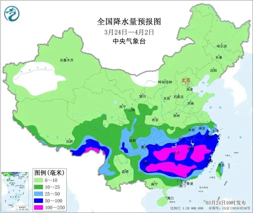 整体来看,未来10天(3月24日至4月2日),江南、华南北部、四川盆地东部及贵州东部、西藏东南部等地多阴雨天气,雨日可达5至8天,大部地区累计降水量有40至80毫米,部分地区有100至200毫米;上述地区降水量较常年同期偏多7成至2倍,局地偏多3倍以上。