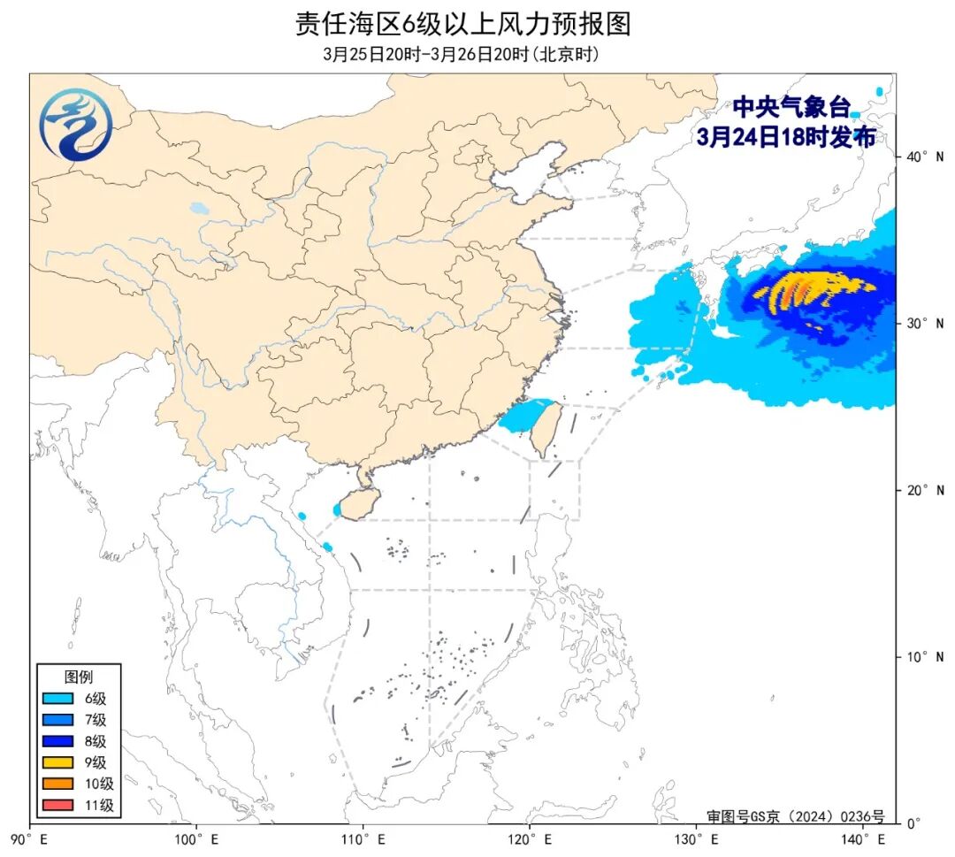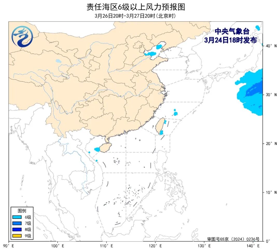 预计,3月27日夜间至31日白天,渤海、巴士海峡、北部湾将有5~6级、阵风7级的风,黄海中部和南部海域、台湾海峡、台湾以东洋面、南海西北部海域、南海东北部海域、南海中西部海域将有6~7级、阵风8级的风,东海大部海域将有6~7级、阵风8级增大至7~8级、阵风9~10级的大风。