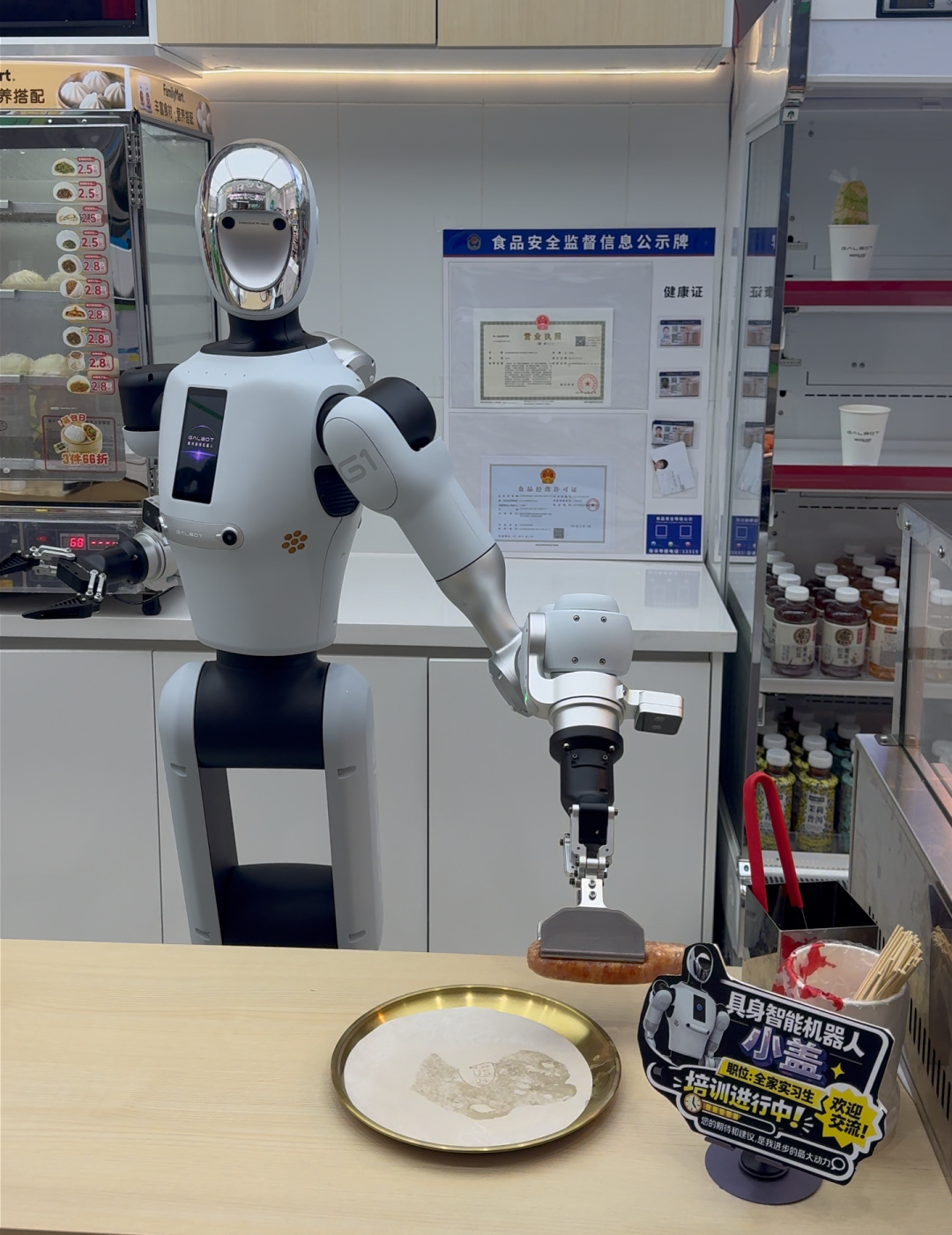 一段无特效、无预设动作的人机网球对打视频,近期在科技圈引发广泛关注。画面中,人形机器人全场灵活跑动、实时判断来球轨迹,0.1秒内即可锁定时速50公里的来球,正手击球成功率超90%,能连续完成20局人机对拉,展现出高动态运动控制与实时自主决策能力。“这款机器人不靠预设动作,而是通过自研算法从人类零散运动信息中自主习得运动逻辑,实现现场实时学习、实时决策。”北京银河通用机器人首席战略官赵于莉说。稳定的运动能力是机器人落地真实场景的重要基础,也是当前具身智能产业技术迭代的核心赛道之一。2025年,我国自主研发的“具身天工 Ultra”以2小时40分42秒的成绩,创下人形机器人半程马拉松完赛纪录;而在近日举行的北京人形机器人半马实训营交付仪式上,北京人形机器人创新中心首席技术官唐剑称,今年将向1小时左右完赛发起冲击,向人类职业选手水平看齐。“人形机器人马拉松比赛,不仅是速度的比拼,更是对人形机器人在稳定性、可靠性、一致性上的极限考验。”唐剑坦言。宇树科技创始人王兴兴在2026亚布力论坛上预测:到今年年中,国内人形机器人百米跑速有望突破10秒大关,达到人类顶尖短跑选手的水平。唐剑也表示,目前国内具身智能产业在硬件本体、运动控制两大方向持续实现技术突破,国产人形机器人动作稳定性、流畅度已达到行业先进水平。如果说运动能力是人形机器人的“躯体”,高质量数据就是支撑其落地应用的核心“养料”,而真实场景的规模化应用,则是检验技术价值的最终标准。长期以来,场景碎片化、不同机型数据不通形成的孤岛效应、数据质量参差不齐等行业痛点,始终制约着具身智能的发展。对此,国内产业界已通过专业化基础设施建设,努力探索高质量数据的规模化生产路径。在北京人形机器人创新中心具身智能机器人数据与训练基地一期(以下简称“数据基地”),近5000平方米的空间内复刻了家居、商超、办公、工业、医药、康养等领域30余个典型场景,120余台不同构型的机器人同步作业,是目前国内场景覆盖最全、机器人构型最丰富的专业化数据采集平台之一。经过流程优化与标准重构,基地数据合格率从三个月前的50%提升至95%以上,建成不到半年已对外交付数万小时高质量实采数据,开源具身智能数据集Robomind下载量突破200万次。该基地正向着“全球首个百万小时高质量数据”的目标全速迈进,为人形机器人从实验室走向千行百业筑牢数据基石。北京人形机器人创新中心具身智能机器人数据与训练基地一期,工作人员正在训练并采集数据。受访者供图数据基建的不断完善,正加速推动具身智能从舞台演示走向真实场景应用。银河通用打造的“银河太空舱”智慧零售解决方案,已在全国20多个城市的核心商圈、景区落地超100个点位。这种最小仅需16平方米的智能零售空间,由机器人全流程自主运营,可完成语音接待、点单支付、商品抓取交付、货架盘点补货等全环节服务,实现长时间无人值守稳定运行。这不仅让具身智能从科技头条融入了城市烟火,更在持续运营中积累了海量真实场景交互数据,形成“场景应用-数据回流-模型优化”的正向飞轮。银河通用机器人G1在全家便利店为顾客夹取烤肠。《瞭望》记者高博翰 摄2026年被业内普遍视为人形机器人“规模化交付元年”,技术落地已从工业制造延伸至商业服务、家庭生活等多个领域。在浙江乐清的生产车间,人形机器人娴熟完成物料搬运与产线流转;在全国多家智慧药店,机器人实现24小时无人化药品盘点与配送;在深圳的居民家庭,国内首批机器人保洁员正式上岗,与人类保洁员协同完成家庭清洁服务。国务院发展研究中心发布的《中国发展报告2025》显示,我国具身智能产业市场规模有望在2030年达到4000亿元,在2035年突破万亿元,并将引领带动多个领域新质生产力跃升。从“机械执行”到“自主思考”,是具身智能区别于传统工业机器人的重要特征,而泛化能力不足,仍是当前行业面临的巨大卡点。唐剑坦言,目前大多数机器人只能在固定场景完成特定任务,难以像人类一样在陌生环境中灵活适配、自主解决问题,突破的核心方向,正是聚焦数据与算法。为破解这一行业难题,国内产业界正以开源开放的模式,凝聚产学研合力推动核心算法迭代。3月19日,北京人形机器人创新中心向北京大学、华中科技大学等国内外多所高校,以及蔚来、中船集团等合作伙伴,交付15台“具身天工3.0”与“具身天工Ultra”机器人本体,同时提供“慧思开物”具身智能平台全维度技术支持,让更多研发力量参与到具身智能大脑的研发中。包括银河通用开源的全身遥操作系统OpenWBT在内,国内多个研发团队正通过技术开放,持续降低具身智能的研发门槛。图为“人形机器人半马”实训营开幕及交付仪式现场。受访者供图这种“技术共享-创新共创-成果共用”的产业闭环,正在为具身智能产业的发展拓宽全新路径。北京人形机器人创新中心有关负责人表示,具身智能行业的发展绝非单一企业的独舞,而是产学研用协同创新的合唱,唯有降低技术门槛,让更多开发者参与进来,才能持续推动机器人思考能力的突破。尽管行业突破接连不断,但仍需清醒认识到,人形机器人要真正实现规模化落地,从“会做”到“做好”,还有多道关口需要突破。当前,高精度自主导航、灵巧手精