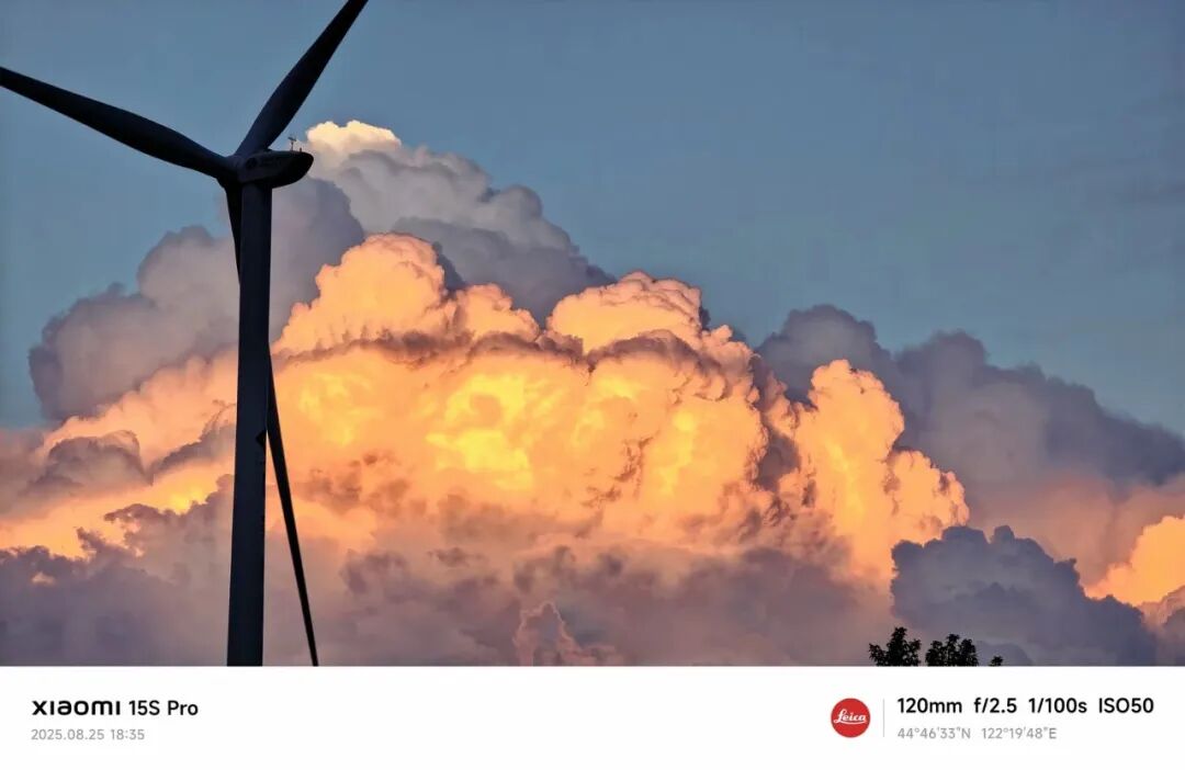 这张照片拍摄于中国吉林省白城市通榆县,时间是 2025 年 8 月 25 日傍晚。画面中,巨大的风力发电机矗立在前景,与背景中被夕阳染成金色的积雨云形成了强烈的视觉对比。