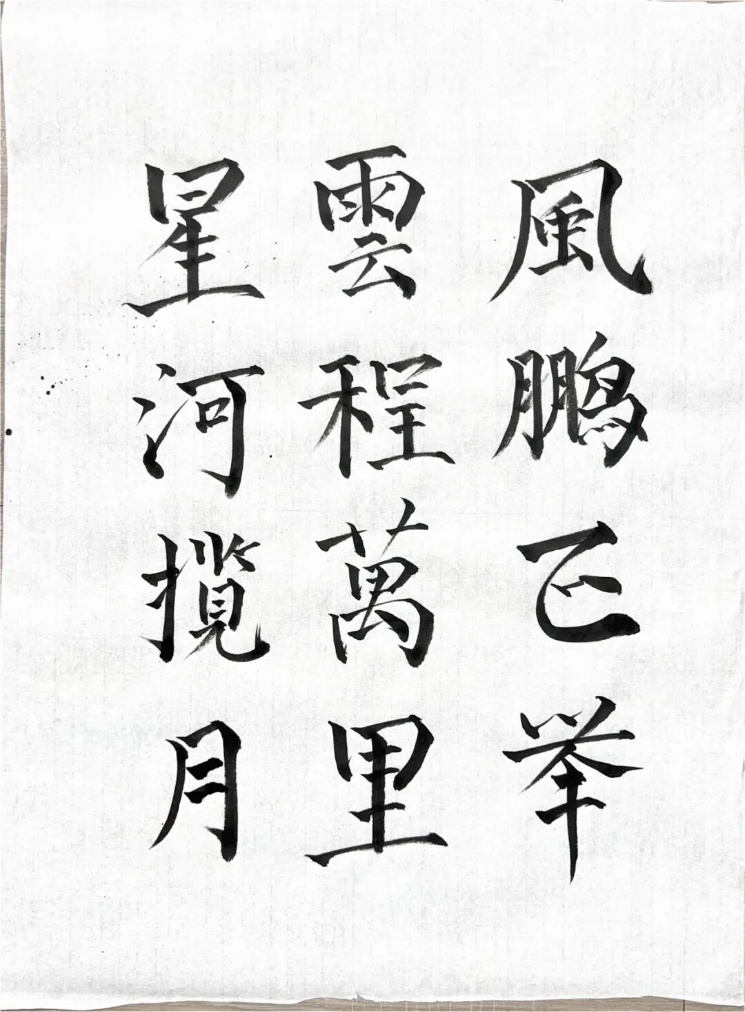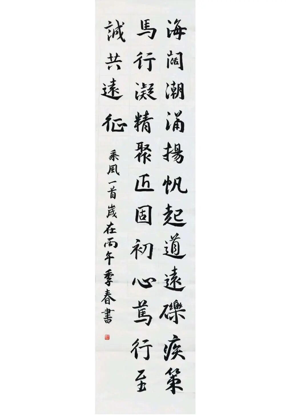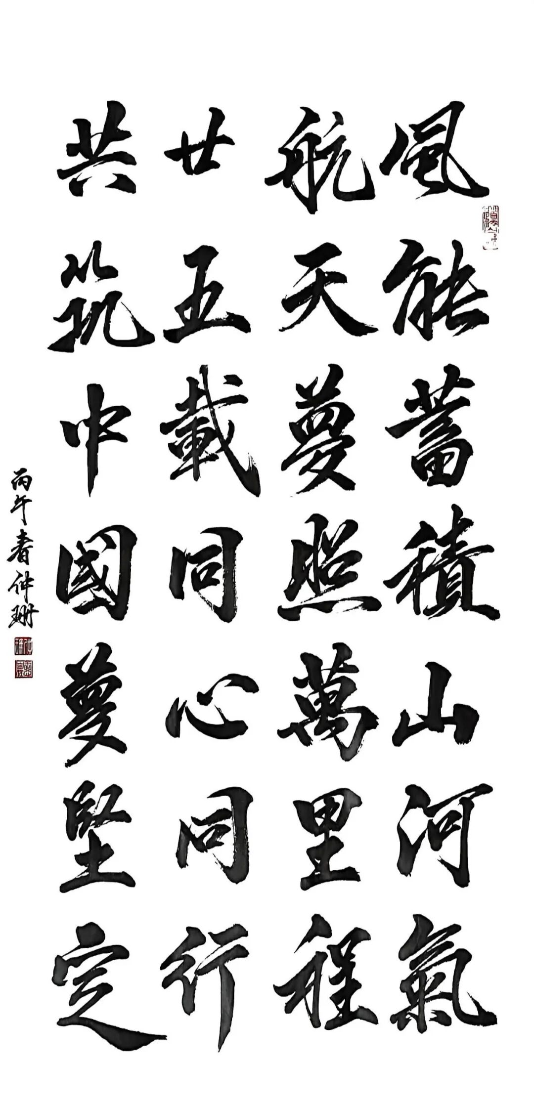 作品以 “风能蓄积山河气,航天梦照万里程。廿五载同心同行,共筑中国梦坚定” 为核心,融自然意象、风能、航天与家国情怀。行书笔法刚柔并济,方笔挺拔、圆笔婉转,厚重中见灵动,既彰显企业硬核实力,亦暗含同心协作的柔韧力量。