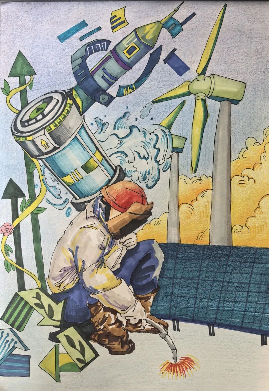 作品以劳动者为核心,融工匠精神、新能源与航天元素,展现绿色发展与科技创新。工人实干担当,风机光伏彰显产业活力,火箭与绿植寓意科技生态共生,传递 “匠心筑梦、科技赋能未来” 的信念,彰显泰胜深耕清洁能源、守护绿水青山的愿景。
