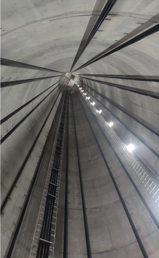 作品《向上》以风电混塔内部为视角,纵深感极强的筒壁与放射状管线,勾勒出工业力量的线条。从底部仰望,光影与结构交织,既展现清洁能源工程的精密严谨,也隐喻着人类向高空、向未来求索的向上力量。