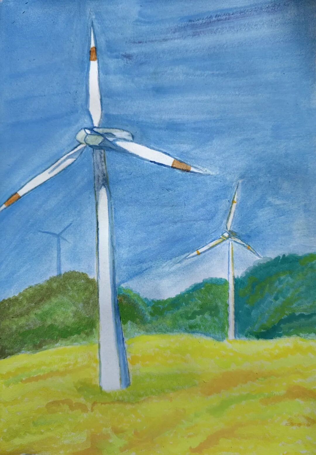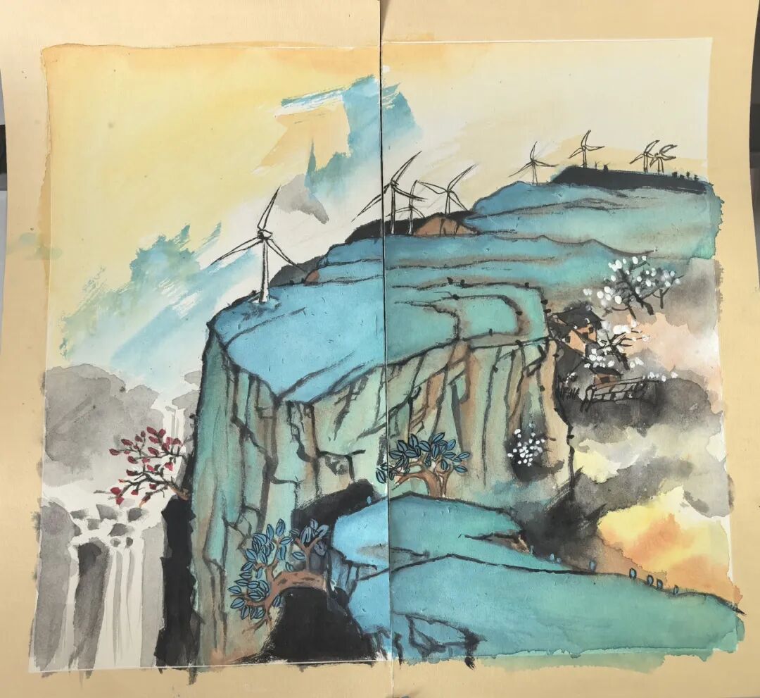 这幅青绿山水将传统笔墨与现代风电相融,苍劲山川间银翼风机矗立,古韵新生相映,既绘山河锦绣,亦颂绿色发展,尽显新时代生态之美与奋进之力。