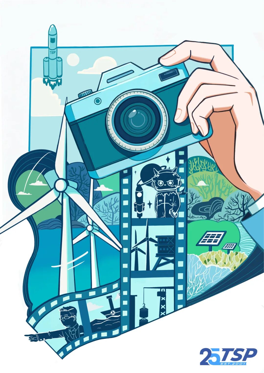 此画为泰胜 25 周年司庆创作:以手臂代表全体泰胜人,用镜头定格 25 年发展历程,涵盖陆上风电、海上升压站、旋筒风帆及商业航天。绿意背景彰显 ESG 与低碳实践,火箭破框寓意泰胜人勇攀高峰、逐梦星辰。